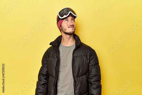 © Asier, Fototapeta premium Man in winter coat with snow goggles on yellow dreaming of achieving goals and purposes