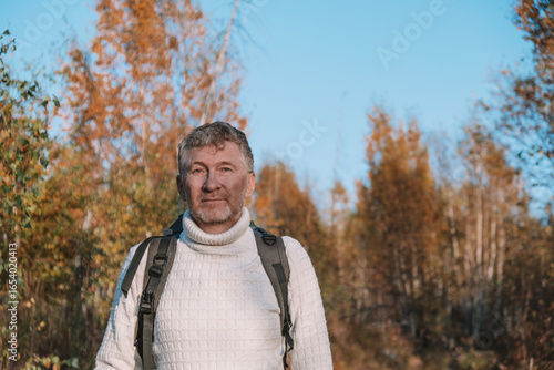 Obraz premium man is hiking through serene forest filled with autumn foliage. he wears cozy sweater and carries backpack while enjoying nature beauty under bright blue sky. close up.