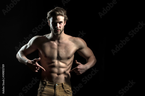 Fototapeta premium Man is pointing at his naked athletic belly. Muscles of young strong bearded guy. Attractive sexy man