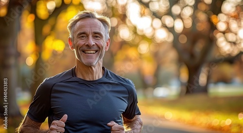 © Margarita, Obraz premium Man jogging outdoors in a park during autumn with golden sunlight filtering through trees, wearing a dark athletic shirt conveying focus and energy