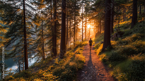Obraz premium Man jogging through a forest trail at sunrise