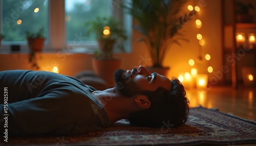 © Viktor, Obraz premium Man lies on carpet in yoga studio with candles. Guy rests during meditation session. Male enjoys relaxation with dimmed light. Person in calm posture gets zen and mindfulness at cozy place.