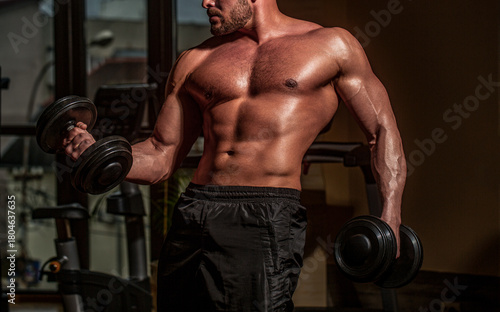 Naklejka premium Man lifting dumbbell in a gym making exercise for muscles, dumbbells. Power athletic man in training pumping up muscles with dumbbell. Strong bodybuilder with perfect biceps curl, triceps and chest