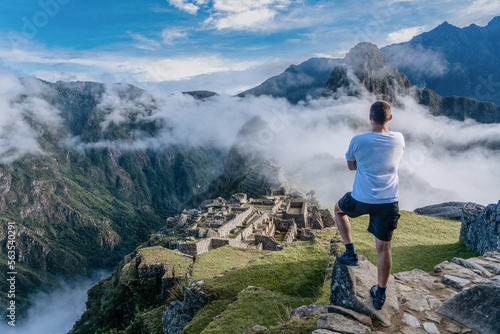 Naklejka premium man looking at machu picchu hotizontal, logo spot