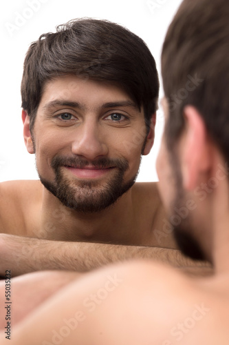 Obraz premium Man looking at mirror. Young man looking at himself at the mirro