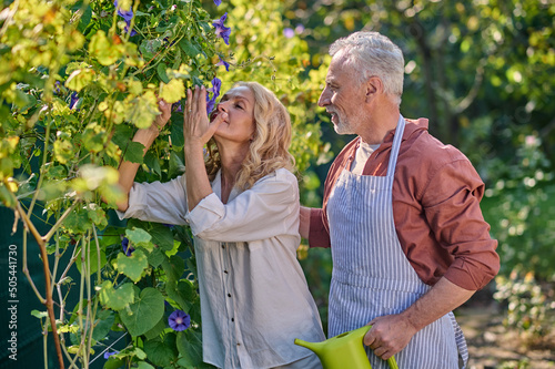 © zinkevych, Obraz premium Man looking at woman enjoying scent of flower