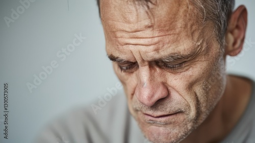 © iuricazac, Obraz premium Man looking down, possibly deep in thought or tired.
