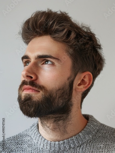 © vefimov, Obraz premium Man looking down, thoughtful expression, neutral color palette, portrait photography style.