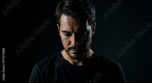 © Anzhelika, Naklejka premium Man looking down with a thoughtful and melancholic expression. Concept of sadness, regret, or deep contemplation for editorial use.