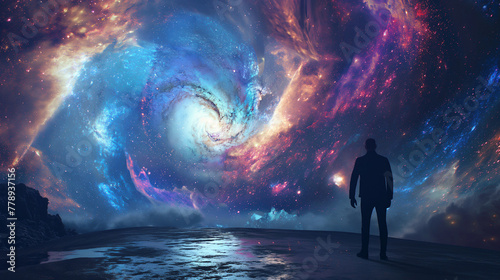 Fototapeta premium man looking hesitantly looking back into the abyss. The gate of initiation of space fabric.