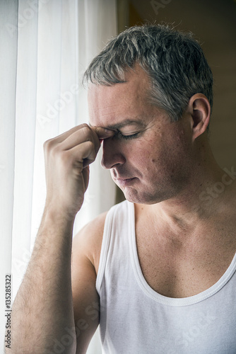 © Dragana Gordic, Obraz premium man looking through window looking worried, depressed