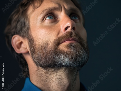 © Priya, Obraz premium man looking up with beard in contemplative pose