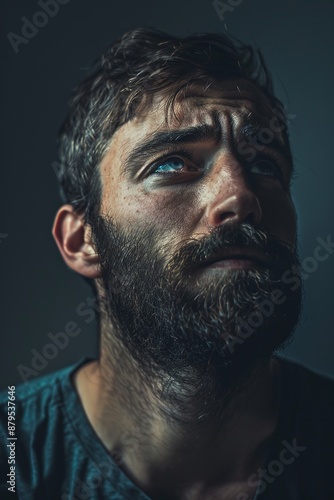© TAHIYA, Fototapeta premium Man looking up with worried expression in low light