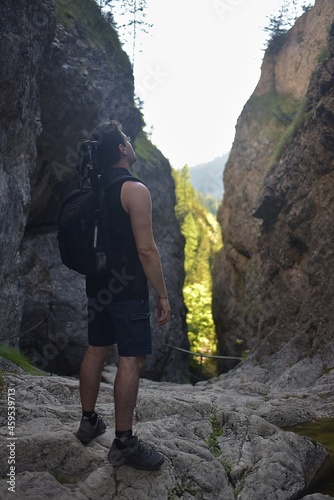 Naklejka premium man looks at a rock wall in the valley