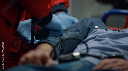 Obraz premium Man lying on stretchers. Medical worker putting tonometer on patient arm