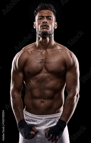 Fototapeta premium Man, muscle and portrait for active, muscular and health for wellness and fit for ripped in studio. Indian person and serious for strong, fitness and power for recreation and workout for fight