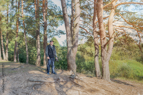 Fototapeta premium Man nature photographer taking pictures in the forest.