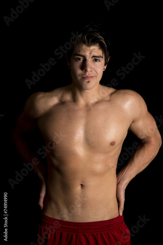 © Poulsons Photography, Fototapeta premium man no shirt red shorts stand on black looking