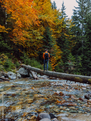 Naklejka premium Man on a log over the river in autumnal forest. Mountain river and hiker...