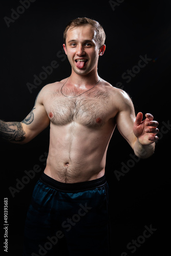 © Ilya, Obraz premium Man on black background keeps dumbbells pumped up in fitness bodybuilding biceps torso, training workout athletic person Young skin human fit