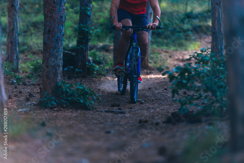 Obraz premium Man on mountain bike rides on the trail through the woods while moving...