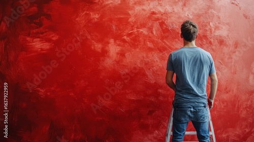 Obraz premium Man on stairs painting wall red, useful for articles about interior design and renovation process.