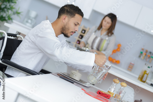 © auremar, Fototapeta premium man on the wheelchair serving himself with water