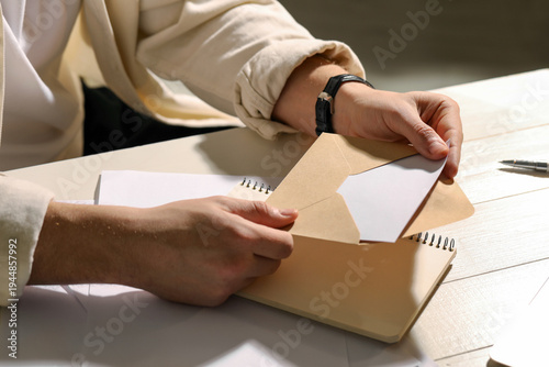 © New Africa, Obraz premium Man opening envelope with letter at wooden table indoors, closeup
