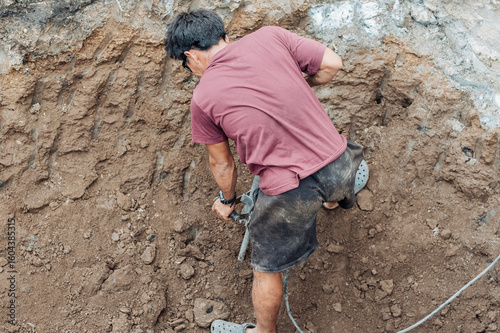 Fototapeta premium Man operating a jackhammer to break soil and compacted ground inside an...