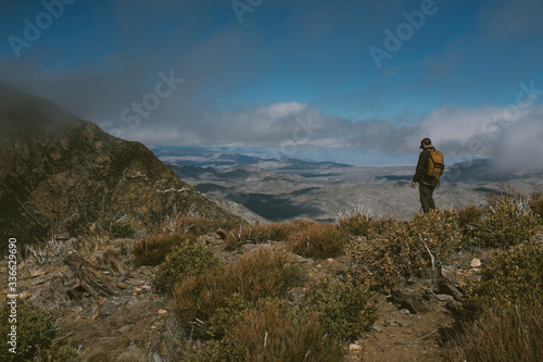 Fototapeta premium man overlooking mountains with blue sky