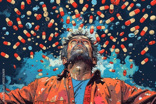 © Paul, Fototapeta premium Man Overwhelmed by Medication, Concept of Overmedication Generative AI