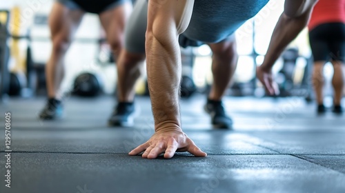 © Generative AI, Naklejka premium Man Performing Advanced Pushups on Gym Floor Showcasing Strength and Dedication in Dynamic Fitness Environment : Generative AI