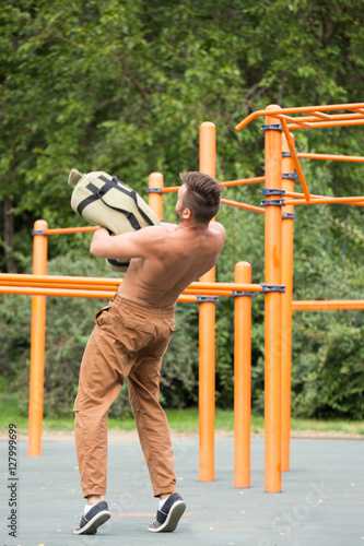 © Rudkov, Obraz premium Man Performing Bag Squat Exercise Outdoor