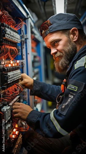 © tongpatong, Obraz premium Man performing electrical repair at a switchboard with fuses.