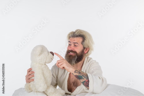 Obraz premium Man play with teddy bear in bed. Man sleep in bed. Bearded man in bed with...