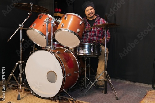 © Rodrigo, Fototapeta premium Man playing acoustic drums in a studio