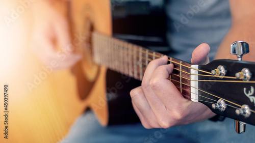Fototapeta premium Man playing acoustic guitar, guitar close up at shallow depth of field