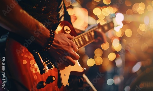Obraz premium Man playing electric guitar on stage with bokeh lights in the background