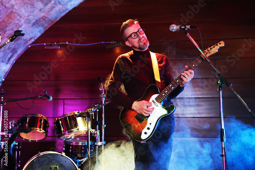 © New Africa, Obraz premium Man playing electric guitar on stage with smoke