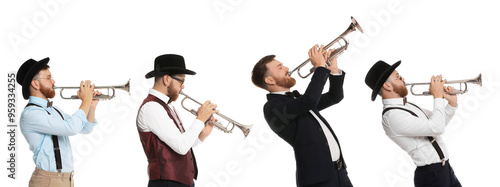 Fototapeta premium Man playing trumpet isolated on white. Collection of photos