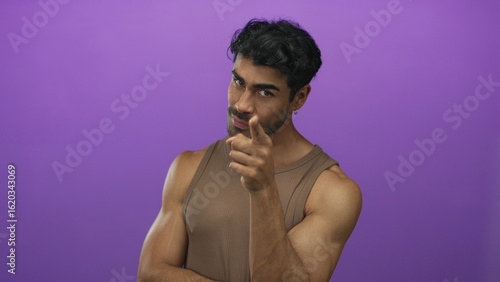 Naklejka premium Man pointing finger to eye in purple studio with bare muscular arms and sleeveless top showing toned biceps; insight clarity precision determination.