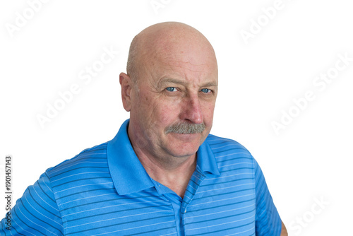 © robertuzhbt89, Obraz premium Man poses with a serious expression wearing a blue striped shirt against a plain background while looking directly at the camera