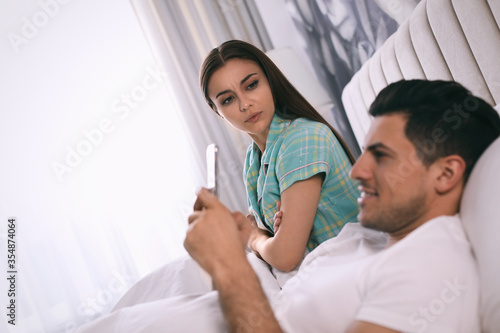 Obraz premium Man preferring smartphone over spending time with his girlfriend at home. Jealousy in relationship