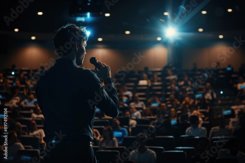 Fototapeta premium Man presenting to a large crowd in conference setting.