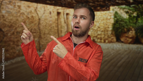 © Krakenimages.com, Fototapeta premium Man prisoner in orange jumpsuit points finger to ceiling in building stone empty room; playful defiance resilience.