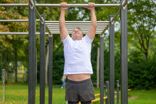 © michaelheim, Obraz premium Man pulling himself up by his arms on parallel bars