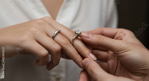 © Khozinul, Fototapeta premium Man putting engagement ring on woman's finger, a romantic gesture of love.