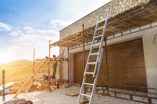 © Halfpoint, Obraz premium Man putting natural stones on a wall