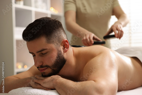 Obraz premium Man receiving relaxing massage with stones in spa salon