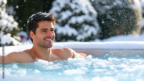 © Enipurwanti, Obraz premium Man Relaxing in Outdoor Hot Tub Winter.